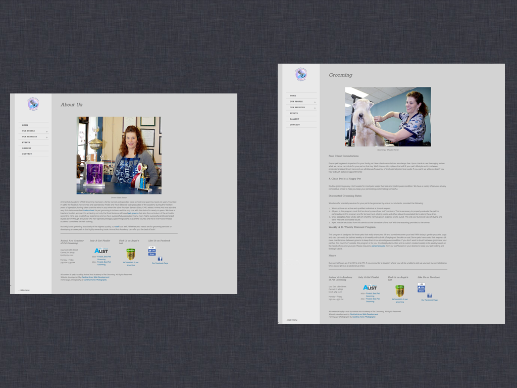 Animal Arts Academy of Pet Grooming is the oldest school of pet grooming in the state of Indiana. Many current pet grooming salons in the state are run by graduates of Animal Arts Academy! However, even a fixture in the pet grooming industry such as Animal Arts Academy had only recently embraced the internet with a website. Recognizing that a professional and attractive web presence was essential to their business, Animal Arts Academy contacted Cardinal Acres Web Development to update their website.