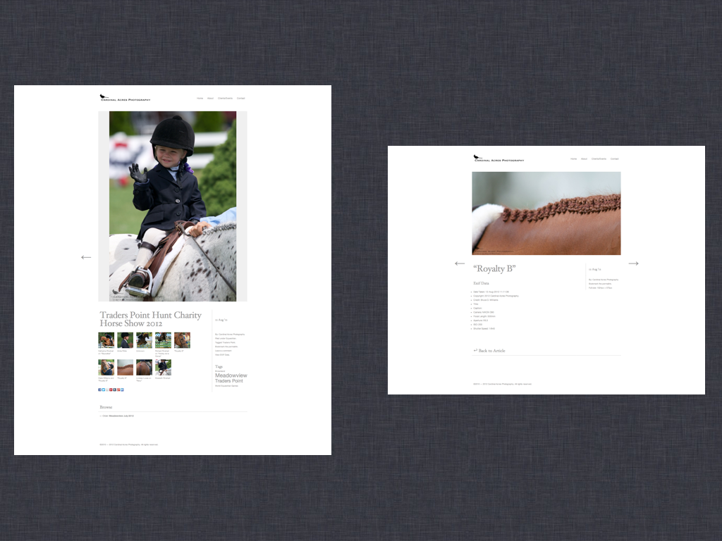 Cardinal Acres Photography is the website of equestrian photographer, Bruce Williams. This is a simple site that showcases Bruce’s photographic work and needs no additional plugins.