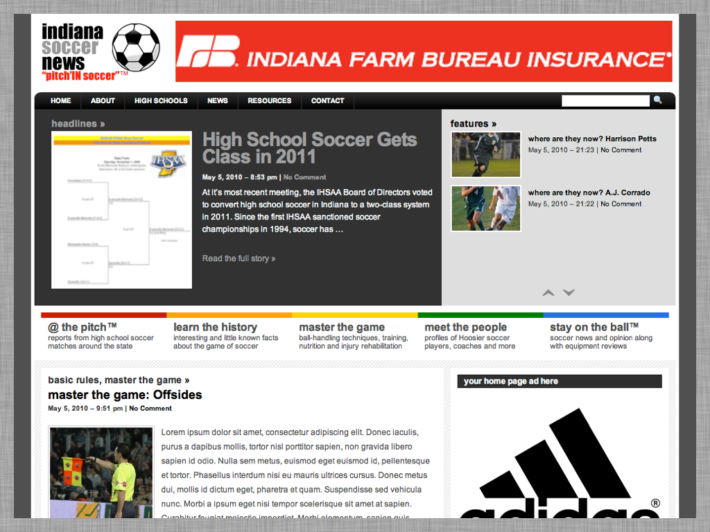 Indiana Soccer News covers high school soccer in the state of Indiana. Game scores, statistics, history of the game of soccer, rules discussions, training recommendations and profiles of people involved in Indiana high school soccer are all part of the site.